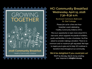 This is an opportunity to learn more about Healthy Community Initiative’s (HCI) vital work, which supports thousands of children, youth, and families. Come celebrate HCI and support youth- and family-serving initiatives in Minnesota. If you are interested in attending HCI’s annual breakfast fundraiser, but have not received an invitation from a Table Captain, please email info@hci-mn.org to get connected.